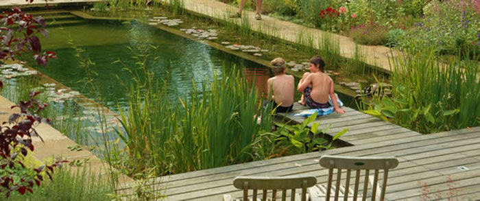 Swimming can be great exercise and a lot of fun, not to mention an exciting sport at the Olympics. But the chlorine used in most pools can have some negative side effects, not the least of which is reliance on toxic (and finicky) chemicals.Chlorine’s damaging effects on hair are well known, but few people realize that a number of studies have linked inhalation of the chemical by swimmers to increased asthma rates (in fact a new Irish study published this April reported a significant link between the number of years a boy had been swimming and the likelihood of the child being wheezy in the past year). A Norwegian study also documented an increased risk of wheezing among children who swim in pools before 6 months of age. Further, in an unpleasant reaction, pee and sweat in water can react with chlorine to form toxic breakdown products known as chloramines.For health, environmental and aesthetic reasons, a lot of people have expressed interest in alternatives to chlorine pools, and luckily there are more and more options to get wet without smelling like cleaning products. Companies offer alternative pool systems that treat water by pumping it through a chamber containing coated titanium plates and copper and zinc ions. Some make ozone injectors that can reduce the need for chlorine up to 90% — there’s been one installed at the White House for years! Some systems rely on a combination of ozone and copper and silver ions, while others are saline, though saltwater pools result in the formation of chlorine in the water.One elegant, eco-friendly solution that has had enthusiastic supporters in Europe for decades is the so-called natural swimming pool, which is slowly beginning to gain buzz in the U.S. Natural swimming pools, often called swimming ponds across the Atlantic, can be beautiful oases of greenery and sustainability, as well as safe, fun places to take a dip.Managed properly, natural swimming pools have crystal clear water and require no chemicals to maintain, as they are self-cleaning mini-ecosystems. The natural pool designers say the systems also have lower maintenance costs than conventional pools, and their installation costs are not much more than standard designs.The possibilities for natural pool designs are nearly limitless, from traditional looks to serene settings that closely resemble wild ponds.